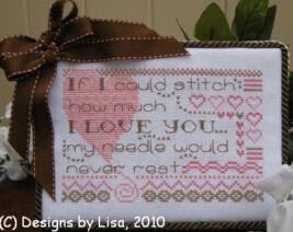 Kathy from Designs By Lisa is having an exclusive sale on this fabulous chart till May 16th. Sale price is $5 and that INCLUDES shipping! Be sure to get over to her website and order b/4 they are gone!